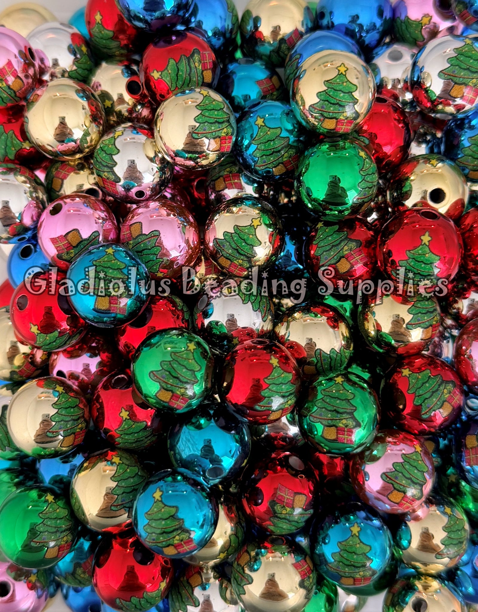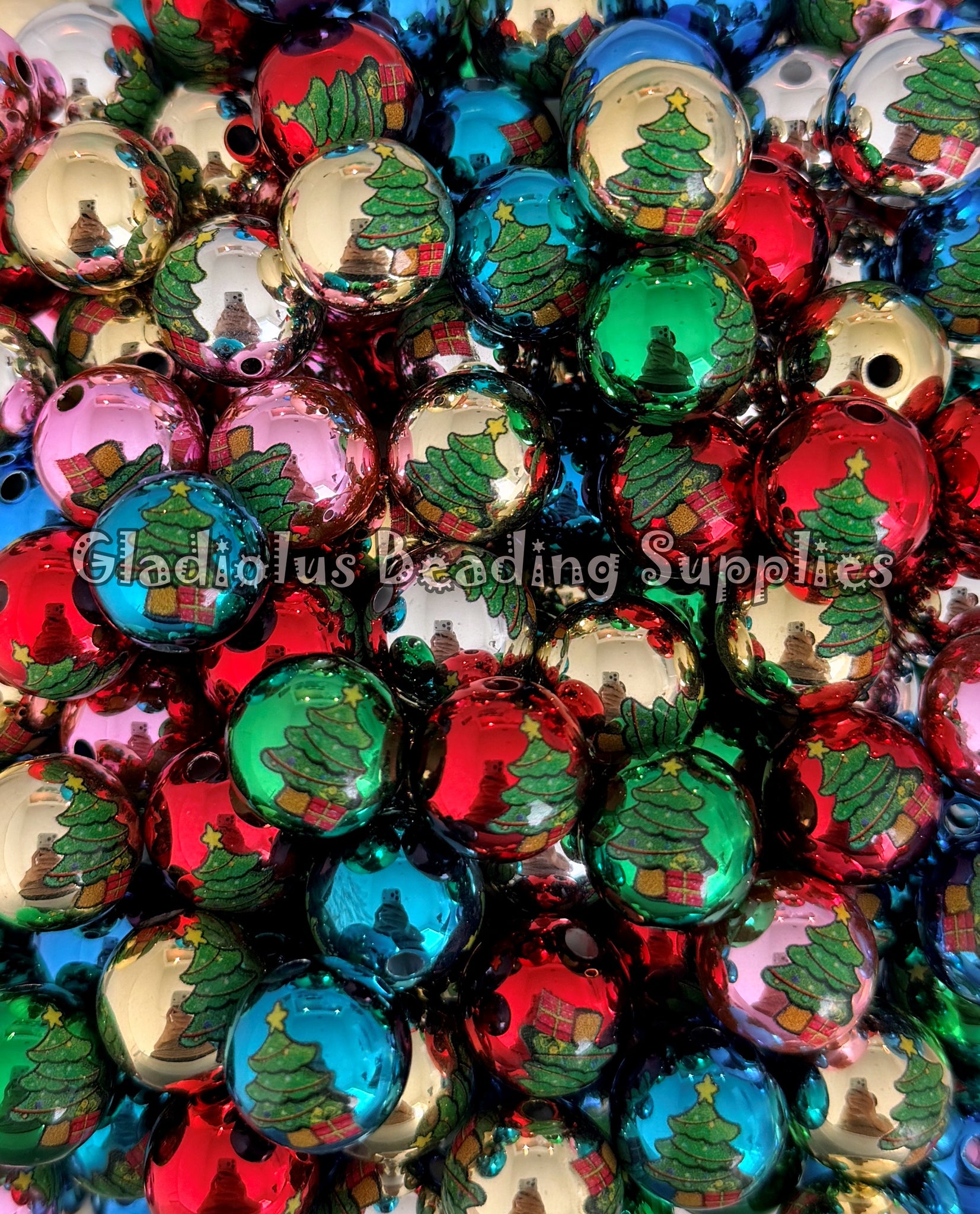 16mm Christmas Tree Print Beads - Acrylic Beads - Bubblegum Beads - Chunky Beads